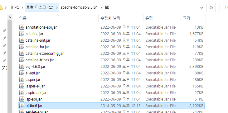 이 경로에 가보면 아래와 같은 jar파일들이 있는데 이중 ojdbc6.jar를 복사하여 tomcat 경로에 넣어줄것이다